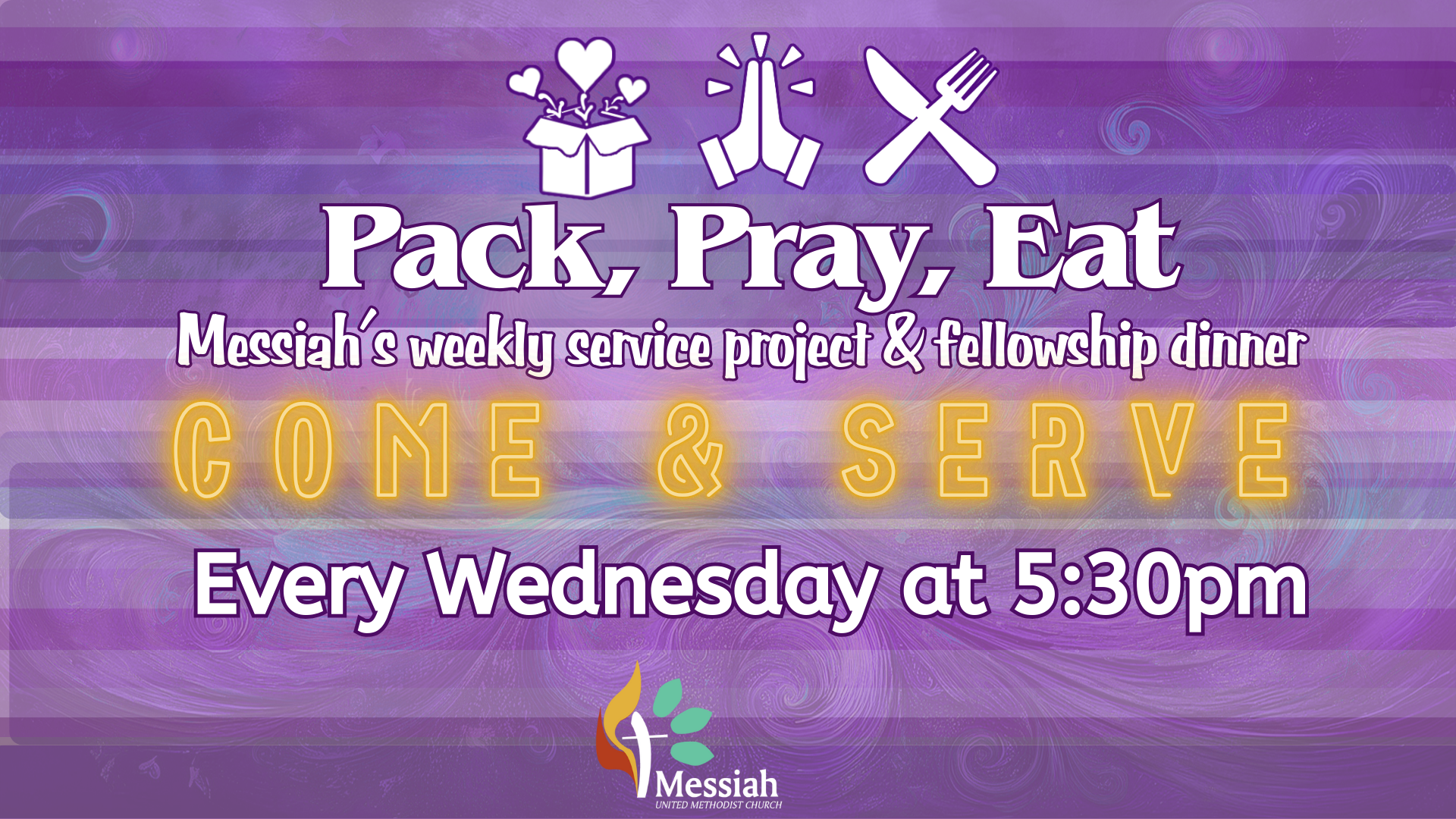 Pack, Pray, Eat is our weekly service project and fellowship dinner. We gather at 5:30pm to perform a service project for our community.